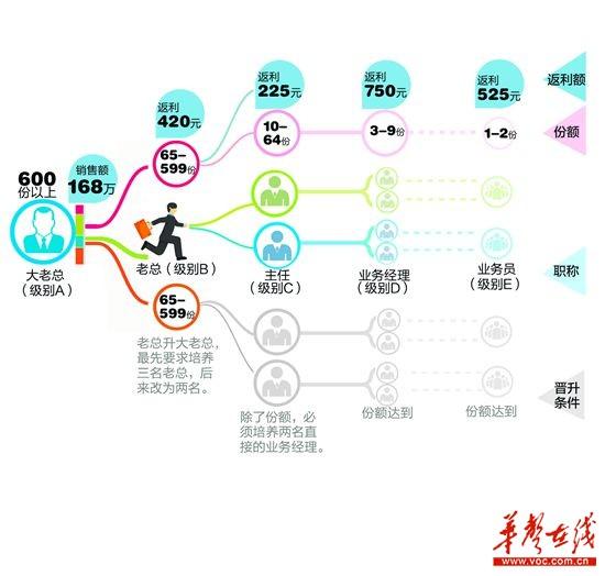 传销组织“天津天狮公司”为ABCDE五个等级塔状结构,从高到低分别是A级为大老总、B级为老总、C级为主任、D级为业务经理、E级为业务员。该传销组织是以“发展人头”为模式,每人收取2800元的入会费,且没有任何产品。每发展一个新会员,公司就会返利:其中业务员返利525元,业务经理返利750元,主任返利225元,老总返利420元。