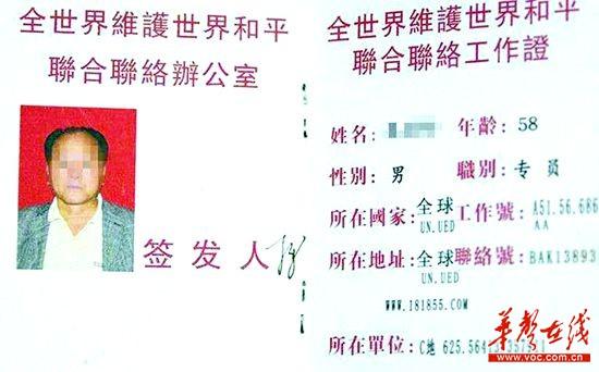 一个证件上面写着“联合国维护部队总司令部特别通行证”、一个上面写着“全世界维护世界和平联合联络工作证”,姓名均为吴某某,职务分别是办事员和专员。矮个男子林某却拿不出证件。“他出来得急,没有带。”吴某某语气生硬地回复。见此,杨海波更加肯定了对方是诈骗犯罪分子。