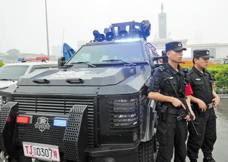 在火车站广场,一辆黑色防暴装甲车特别打眼,长沙市公安局特巡警支队第四特警大队6名全副武装、荷枪实弹的特警队员目不转睛地注视着周边区域的治安状况。带队的第四特警大队副大队长黄伟军介绍,他们主要负责火车站及周边区域的巡逻防控,这台防暴装甲车车身为新型钢材制造,车身防弹,可同时乘坐10人,车内两侧有数个射击孔,车顶配备声波和催泪瓦斯发射塔,特警队员既可朝目标发射声波和催泪瓦斯,也可实施射击。特警队员们分别配备了79式微型冲锋枪和92式手枪,确保周边一旦发生重大突发案件,能第一时间处置。