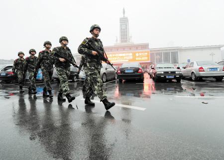 昨日下午,长沙火车站广场,全副武装的武警在巡逻。