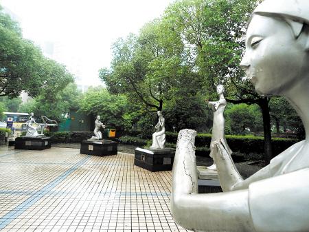 “前一段时间,被一个乞丐敲烂的。”在附近休息的一名女环卫工透露。此说法得到了西湖社区负责人伍紫琴的证实,她介绍,本月上旬的一个晚上,一名喝醉酒的流浪汉手持铁棍把6个雕塑全部打烂了,社区工作人员拦住他,并随即报警。