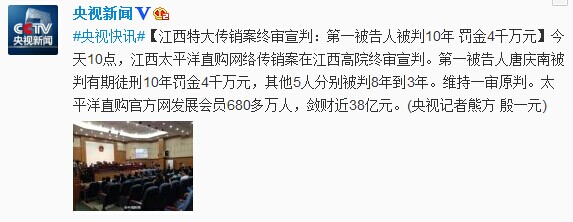 中新网5月29日电 据央视新闻微博消息,今天10点,江西太平洋直购网络传销案在江西高院终审宣判。第一被告人唐庆南被判有期徒刑10年罚金4千万元,其他5人分别被判8年到3年。维持一审原判。