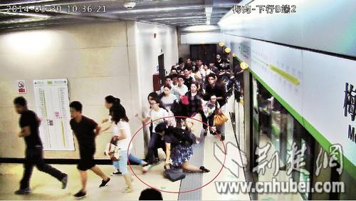 图为:“碎花裙”女子跌倒在站台