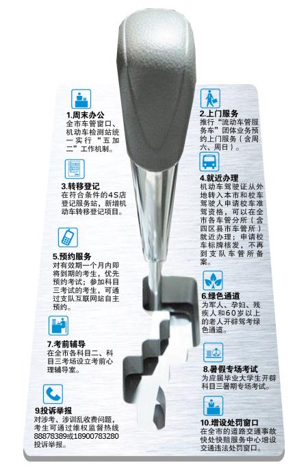 双休日有时间办事的时候,办事的窗口却关了,不少车主只得在上班时间请假办事。从今日起,长沙市公安局交警支队新推十项便民服务举措,其中全市车管窗口、机动车检测站统一实行“五加二”工作机制,双休日正常办公,方便大家在休息日办理正常车管业务。