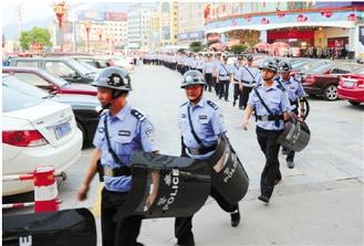 昨天傍晚,东阳市公安局南市派出所武装巡逻启动仪式在市区好乐多广场举行。为维护辖区社会治安稳定,严厉打击违法犯罪活动,增强人民群众安全感,日前,东阳市各派出所科学部署武装巡逻警力,实行武装巡逻工作常态化,形成对暴恐活动、严重暴力犯罪的巨大威慑力和高压态势。 (东阳日报记者 包康轩 通讯员 蔡伟华/摄)