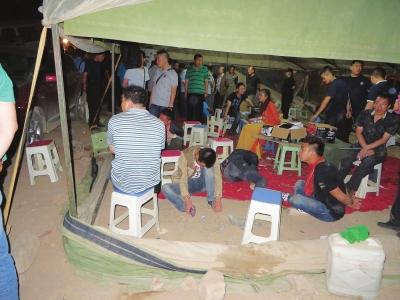 6月9日凌晨1时许,局长马冬生坐镇指挥,副局长赵振国、金江海、金积虎靠前指挥抓捕,分别带领80余名警力兵分两路突袭行动,利用地形地貌和优势警力,克服天黑、赌博点暗哨多、犯罪团伙反侦察能力强、地形复杂等不利因素,经过两个多小时的紧张工作,抓获马某某、廖某某、丁某某、张某某、刘某某、吴某某、魏某某等违法嫌疑人54名,其中女性15名,缴获赌资40余万元。查缴筹码牌、骰子、赌博碗子、赌博台桌等一批赌具以及砍刀4把、木棒4根、垒球棒2根、铁棒1根和对讲机4部。查扣涉案车辆19辆、摩托车1辆。现场还查获验钞机3台、POS机1台、100平米帐篷1顶、柴油发电机2台。在随后的审查中,还抓获了三家赌博“板将”(垫资公司)的人员,一举捣毁了这个特大赌博团伙。