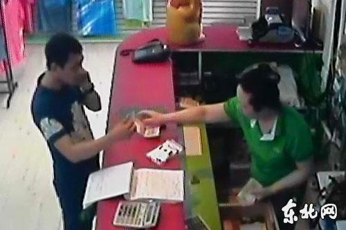记者在店内的监控录像上看到,15日11时23分许,一名穿蓝白相间衣服男子一边打电话一边进入店内,该男子选了一双袜子后到柜台结账。他先掏出一张百元钞票给宋某,宋某将钞票经过验钞机后开始找钱,这时男子右手伸进右侧裤兜深掏一下,似乎是表示袜子不要了,随后宋某将百元钞票还给他,男子迅速将钞票揣进右裤兜,并用手指夹出一张百元钞票表示又买了,毫无防备的宋某收下了钱,并找给该男子部分现金,随后男子离开商店。