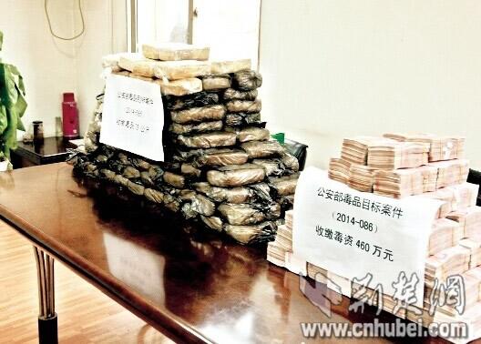 图为:警方缴获的毒品和毒资