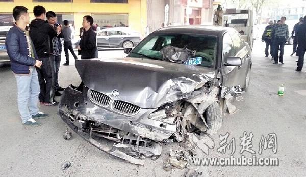 图为:宝马车头被撞得稀烂