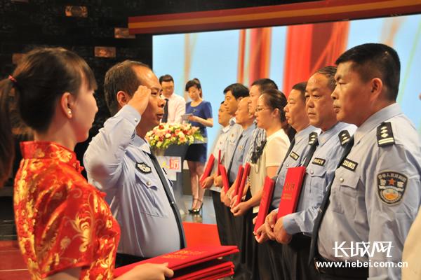 全国公安系统一级英模周希胜为“最美政法干警”颁发荣誉证书。长城网赵永刚 摄