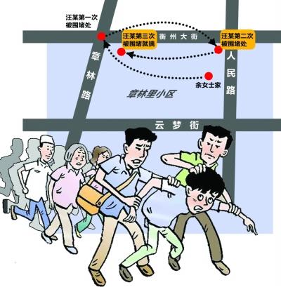 追出约200米远到衡州大街与章林路交会处时,人们发现一穿小方格短袖衬衫的中年男子正低头行走。余女士上前一把抓住该男子的手,中年男子恶狠狠地对余女士说“劝你们放过我,别和我结仇。”追抓的众多居民欲将该男子按在地上,中年男子一下挣脱了,又跑向了章林路上。