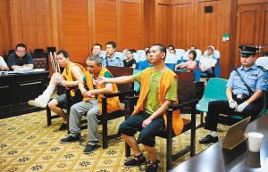 在庭审现场,被告人徐国庆(右一)拒不承认参与名画被盗一案 。 翟小雪 摄
