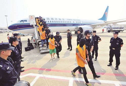 昨日下午3时03分,广州飞往武汉的CZ3346航班降落天河机场,普通旅客下机后,全副武装的特警登上飞机,押下31名戴着头套、身穿黄马甲的嫌疑人。同一航班一次押解31名从境外抓回的犯罪嫌疑人,武汉警方创下一项全国纪录。