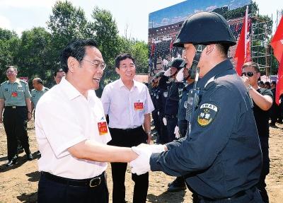 7月14日,省委书记王儒林、省长巴音朝鲁出席吉林省公安武警反恐维稳实战演练汇报会。图为王儒林、巴音朝鲁亲切接见参演民警和武警官兵。 本报记者宋锴摄