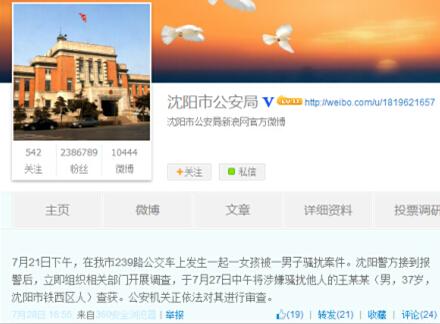 此事经报道后,引发了网民的广泛关注与讨论,并通过网络寻找该男子。沈阳公安也立即介入调查。昨日,沈阳公安局官方微博通报称该男子已被查获。据介绍,7月21日下午,沈阳市239路公交车上发生一起一女孩被一男子骚扰案件。沈阳警方接到报警后,立即组织相关部门开展调查,于7月27日中午将涉嫌骚扰他人的王某某(男,37岁,沈阳市铁西区人)查获。公安机关正依法对其进行审查。(田雪)