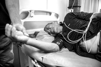 64岁的庞先生被打后表情痛苦,正在医院接受治疗。京华时报记者朱嘉磊摄