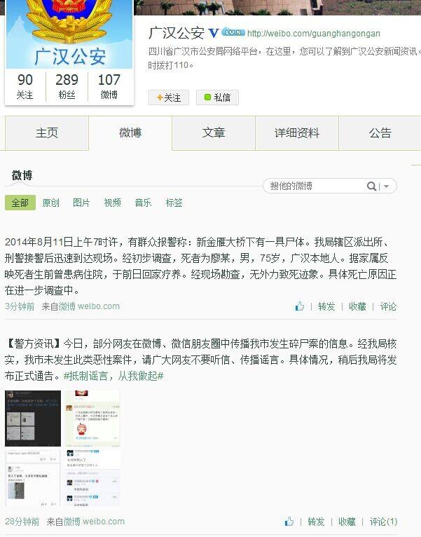 参与互动(0)今日,有网民在微博、微信中传播四川广汉市发生碎尸案,引发网民关注。随后,广汉市公安局官方微博通报澄清,今晨发现尸体并无外力致死迹象。