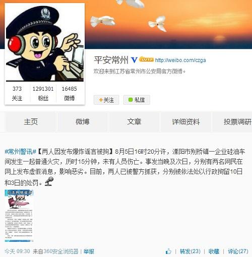 两网民造谣“常州一化工厂爆炸致23人死亡”被拘