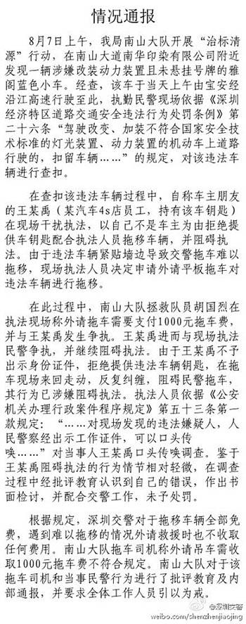 12日晚,深圳市公安局交警支队通过官微通报了调查情况及查处结果,据介绍,该事件发生于8月7日上午,深圳交警南山大队在南山大道附近发现一辆涉嫌改装动力装置且未悬挂号牌的雅阁蓝色小车。经查,该车于当天上午由宝安进沿河高速行驶至此,执勤民警依法对该车进行查扣。