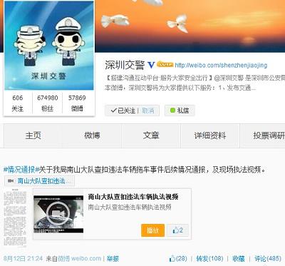 8月7日,网民王先生将“深圳交警南山大队拖移车辆欲收取1000元拖车费”的视频上传至其个人微博,该视频一经发布即引发热议。深圳交警督查部门也对此表示关注,并介入调查此事。