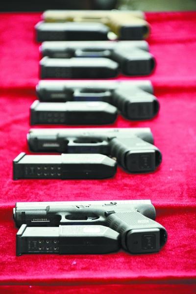 图为现场展示收缴的格洛克手枪。 实习生周迪 摄