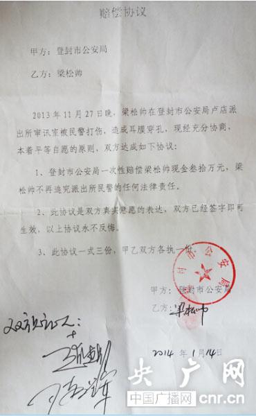 协议上有这样的陈述,“梁松帅在登封市公安局卢店派出所审讯室被民警打伤,造成耳膜穿孔”,登封市公安局副局长赵建勋曾在接收媒体采访时表示,登封市公安局曾调查梁松帅一案,但因被举报的警察都不承认打人,而梁松帅在派出所受了伤,就跟他签了那份赔偿协议书,以尽快化解矛盾。
