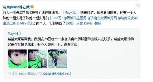 9月2日上午10时许,网友“May-风儿”分别在其新浪和腾讯微博发布消息称,其朋友穆立影8月29日晚11点在济南市历城区华山镇失去联系,希望大家行动起来帮忙提供线索。最初这条信息并未广泛传播。随后该网友又增加了失踪朋友的信息,并且将该信息告知济南警方和济南当地部分微博名人,由此引起了网友的广泛关注。