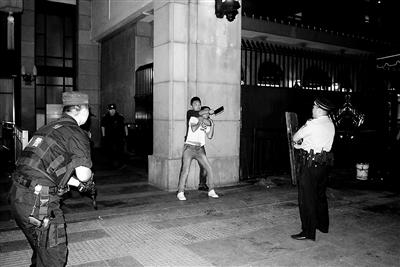 在现场,2101处置组民警、辅警手持灭火器、灭火毯等设备控制了该男子。突然,该男子的另一名同伙,从包里也拿出一个装有汽油的瓶子欲自焚,后被手持钢叉、盾牌的两名铁路特警控制。 (记者 池海波 摄影/本报记者 汪震龙)