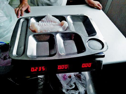 样品五是封装的某品牌黄花鱼正在特价出售卖10.4元一斤。包装标明净含量500克,记者称得总重量是628克,化冻后重440克,比标注的净含量少了60克!