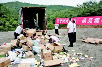 ▲两千多公斤不合格食品药品销毁。 记者 王帅 摄