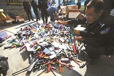 昨天上午,3万余件地铁安检工作中查获的违禁品及乘客自弃限带物品在昌平水泥厂被集中销毁。据北京市公安局公共交通安全保卫总队负责人介绍,2014年地铁安检,共查获禁、限带物品10万余件,其中刀具类4.8万件,易燃易爆物品4.2万件,爆炸品、毒害品、腐蚀性物品等其他共计1万余件。