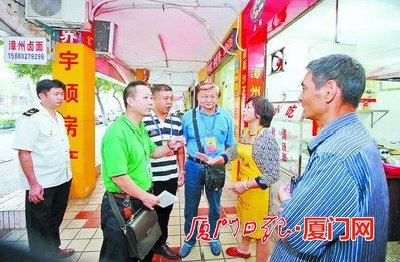 湖里环保分局执法人员在市民评代表的监督下向店主提出整改要求。(本报记者 王火炎 摄)