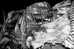 满载冷冻羊肉的大货车严重变形 (记者 卢伟山 摄)