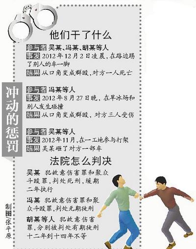 冯某和吴某的落网还牵出两起斗殴案。就在命案发生前3个多月,冯某还参与了一起聚众斗殴案。2012年8月27日晚,冯某和陈某在新阳附近一家旱冰场滑冰。因不小心互相碰了一下,陈某与受害人张某发生口角,继而,双方都叫来了人,冯某和陈某一方,还带了砍刀等工具。
