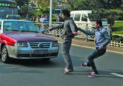 “在栈桥附近,有名男子跳海寻短见,真是吓人,你们快过来看看。”23日下午1时30分许,市民曹先生拨打早报热线82888000报料,记者闻讯赶到事发现场,只见一名身穿浅色毛衣的男子神志不清地站在沙滩上边哭边喊,随后,他突然跑出沙滩,翻过人行道上的护栏,一头扎进马路,就往车流里钻,情况十分危险。就在此时,记者看到一名男子紧跟着那名男子冲上了马路,就在其要被路过的车撞上之际,后面跑来的男子一把将其拉住,可是轻生男子还想挣扎着往车上撞,这名男子只好将其摁倒并控制在路边。