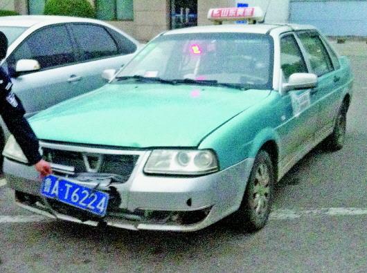 ◤车头受损的肇事出租车。 见习记者 郑帅 摄