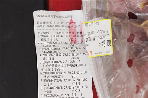 11月11日晚上10时许,谢先生与朋友在鲁班路东凯国际商业广场冠超市购物。交钱后不久,谢先生将所购水果拿出来准备食用,却发现有近200元的水果已经超过保质期,其中一份价值45.8元的进口红提保质期更是标注10月26日,超出保质期近半个月。谢先生当即与朋友来到超市服务前台要求超市方对此事负责。