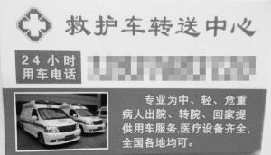 专业救护车辆,专业急救设备,专门运送危重症病人,24小时随叫随到……经常出入医院的人们不难发现,写有“专业救护车”字样的名片,几乎对省会大型综合性医院形成了“围攻”之势。在省二院、省三院、省四院、石市一院、省中医院等医院,无论是病房里,还是走廊里,甚至是厕所里,时常会出现“专业救护”的名片。“我们病房每天几乎都会有人来送名片,除了有专业陪护的推销外,专业救护车辆占到了相当一部分。”在桥西区一家大型医院神经内科住院的李女士说:“这些名片上大都标明是专业医疗救护,声称车上有先进的急救仪器,还配有呼吸机等。”