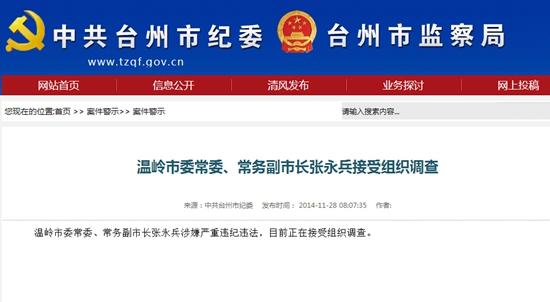中共台州市纪律检查委员会网站“台州清风网”今天通报:温岭市委常委、常务副市长张永兵涉嫌严重违纪违法,目前正在接受组织调查。