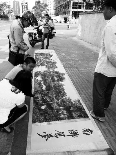随后,走过来两男一女3名年轻人,他们停下脚步仔细看了一会画后询问价格。“1000元就要了,如果是名画不会这么便宜,不过如果是高仿临摹的挂起来看也可以。”其中一名穿黄色T恤男子对卖画男子说。一看有人欲解囊买画,卖画男子顿时来了精神:“刚才有人出1500我都没有卖,加一点就卖给你了。”黄色T恤男子说:“加100元,要卖就卖了。”“好吧,1100元贱卖了。”卖画男弯腰卷起长卷画,准备出手。