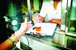 经过保卫室,紧邻的两间医生办公室锁着门,一扇小铁窗连接病人和医生。医生递给病人粉红色的专用病单,病人签字后,又递出装有暗红色液体的塑料杯,里面装的正是美沙酮,服药剂量根据每人的病情而定。