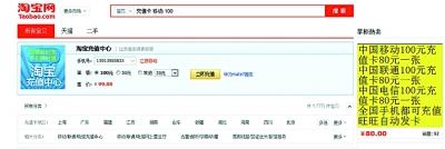 近日南京市民徐小姐需要充手机话费,于是便按照老习惯打开了淘宝网,点击进入淘宝充值首页,在这个页面右侧醒目的“掌柜热卖”推荐的充值广告引起了她的关注,根据上面的表述,自己只需要花费80元就可充值100元的话费。