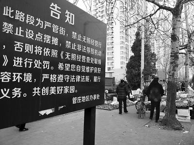 路边市场中,每隔二三十米就有一块由管庄地区办事处制作的蓝色告知板,“此路段为严管街,禁止无照经营行为,禁止设点摆摊,禁止非法停放机动车辆……”