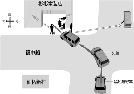 肇事的是辆黑色越野车,当时是从街对面的小巷开出来的。不知怎么回事,车子突然加速,一头撞进了童装店店门,然后被弹回去,原地打转后才停下来。