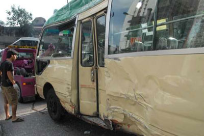昨日上午八时许,一辆双层巴士接载四十多名乘客,沿青衣长康路往青衣路方向行驶,途经长康邨对开涌美路交界时,一辆专线小巴从青康路驶出路口右转,巴士收掣不及,车头狂撼专线小巴左边车身,车头毁烂及挡风玻璃爆裂,专线小巴则左边车身凹陷,一列玻璃窗爆裂,两车上共十二名男女乘客头及手脚撞伤。救护员接报到场,由于受伤人数众多,分由多辆救护车送院治理,警方正调查车祸成因。
