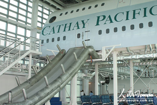 国泰城里有专门的安全训练中心,这栋大楼的顶楼里面有以供新进的空服员做逃生演练的地方,还有逃生滑梯,以及各式各样的紧急逃生的装备的展示,还有一间模拟客舱失火的房间,让空服人员模拟如果客舱失火,在伸手不见五指的情况下,如何用手电筒寻找以及帮助其它未逃生的乘客,效果真得很逼真。