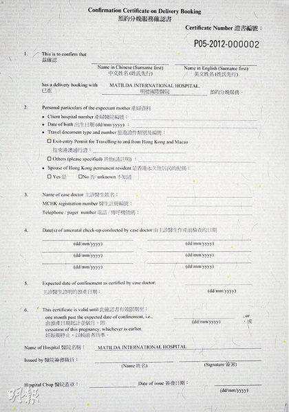 不论公、私医院预约证书,均须填上孕妇中英文姓名、出生日期、旅游证件类别及编号、预产日期,和将在哪院分娩,医院须盖章确认。私院预约证书要额外填上主诊姓名、注册编号和联络号码,以及主诊医生产检日期,签发证书医院职员亦要签署作实。