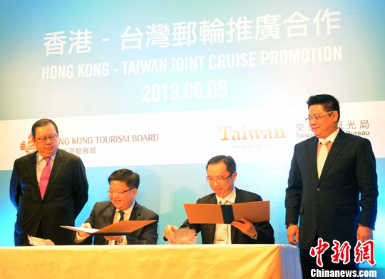 6月5日,香港旅游发展局与台湾观光局宣布,双方将加大合作力度,共同推动两地邮轮旅游发展并签署协议。中新社发 任海霞 摄