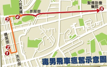 毒男飞车先后撞的士、小巴及客货车。毒男倒车再撞的士,掉头逆驶出弼街,转出洗衣街再撞一车。