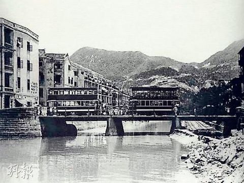 图为1920年代,电车驶过在湾仔明渠上的鹅颈桥。(网上图片)来源:香港《明报》